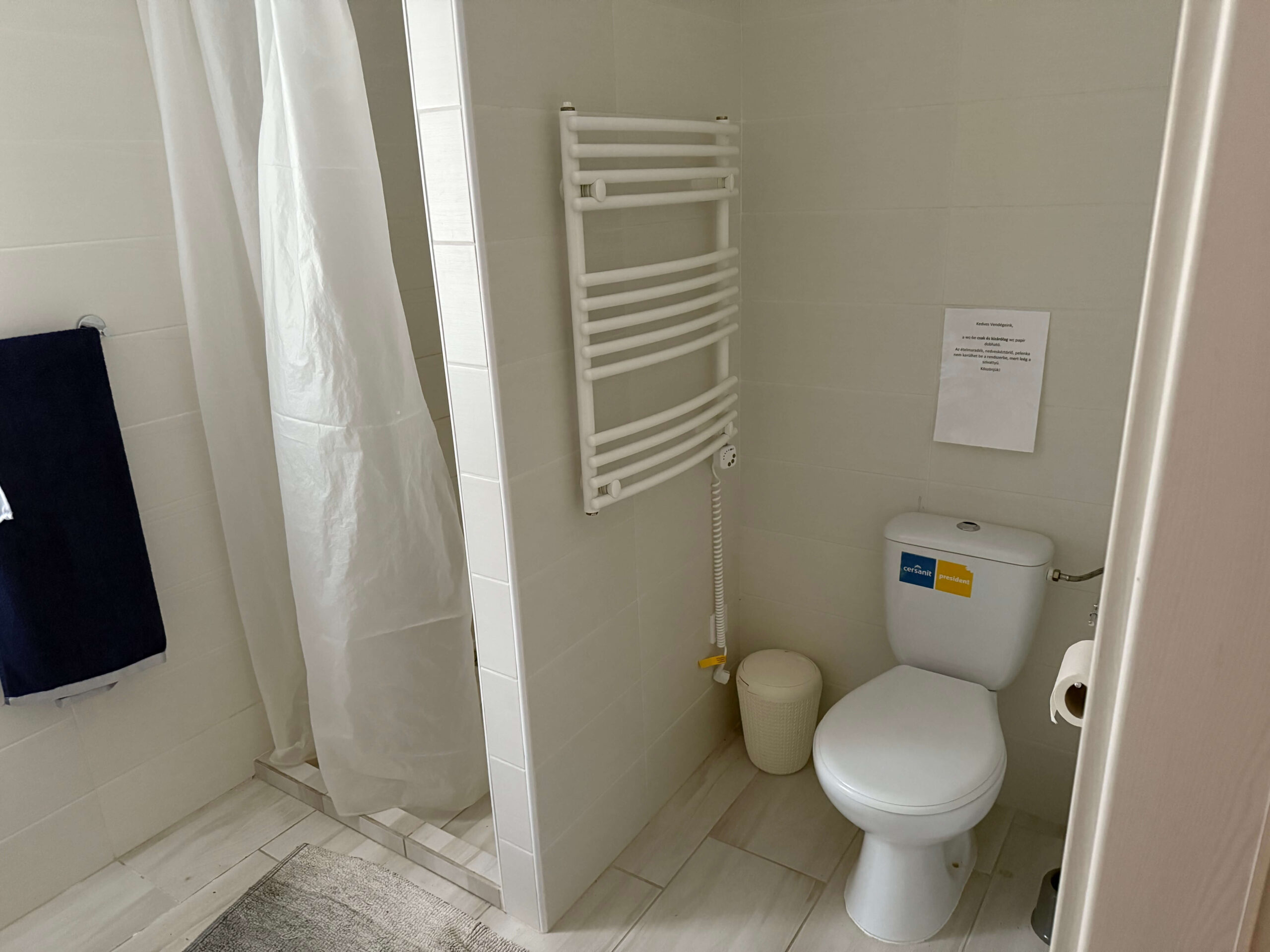 Zuhanyzó, WC, 4kg -os mosógép, kéztörlő található.